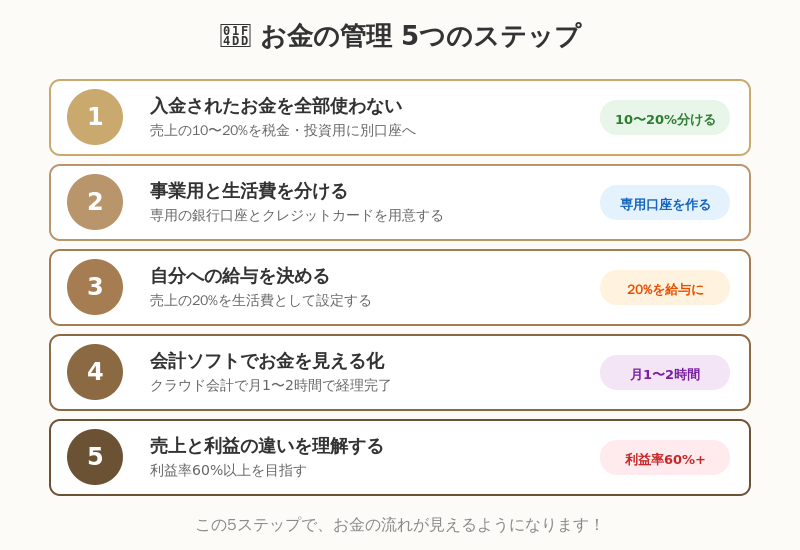 - 入金されたお金を全部使わない:売上の10〜20%を税金・投資用に分ける